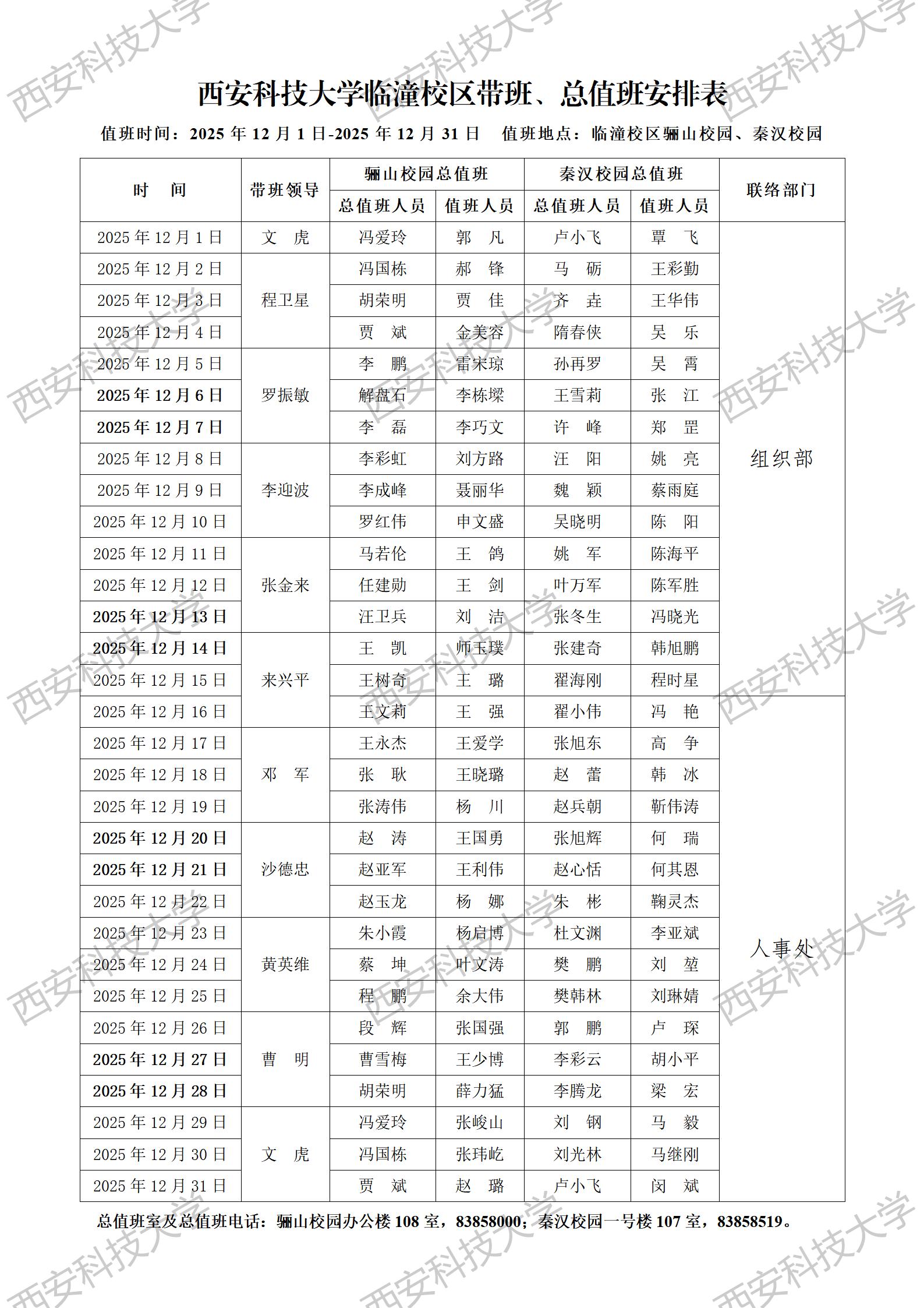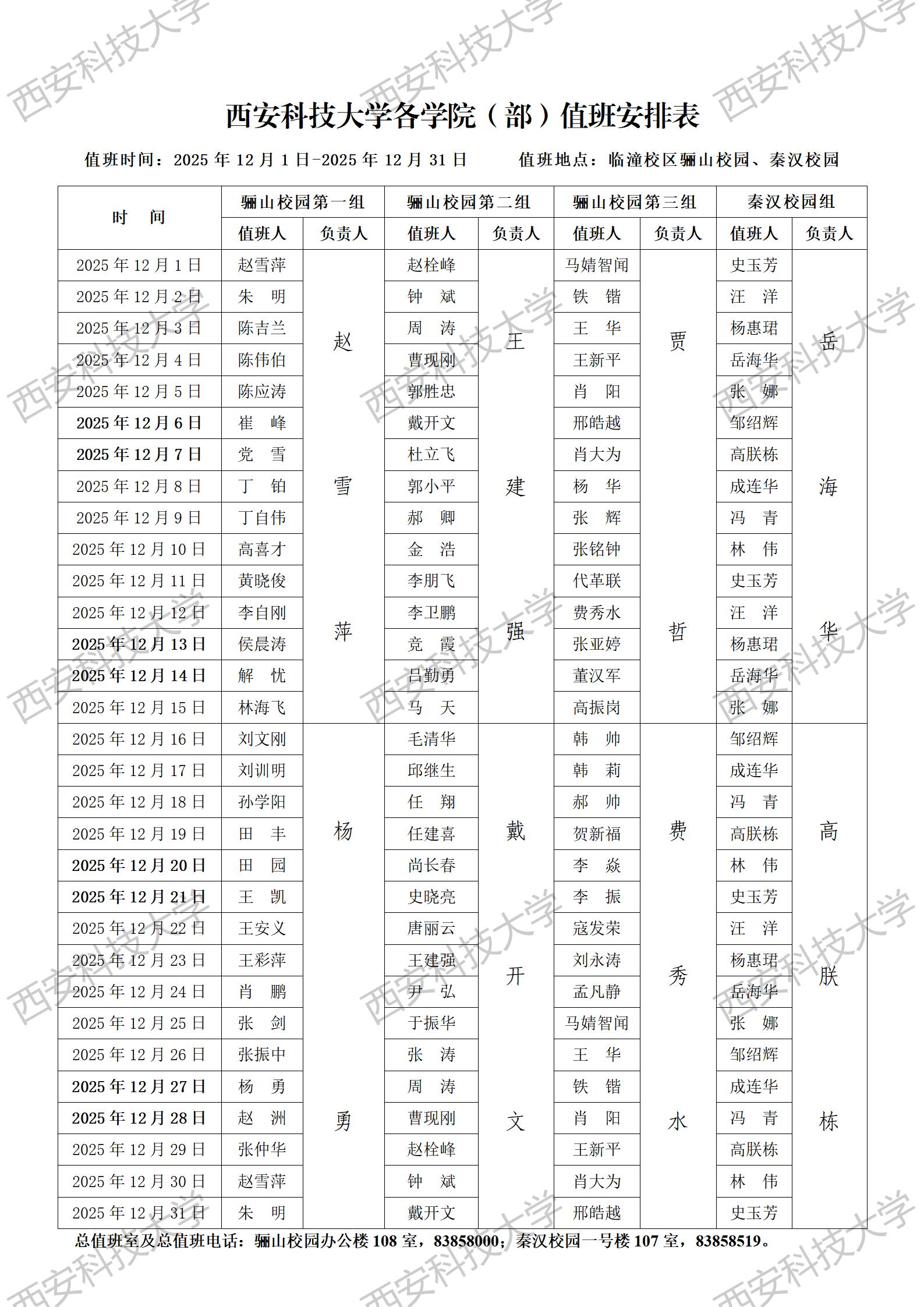 1、西安科技大学临潼校区带班、总值班安排表2025年12月1日-2025年12月31日