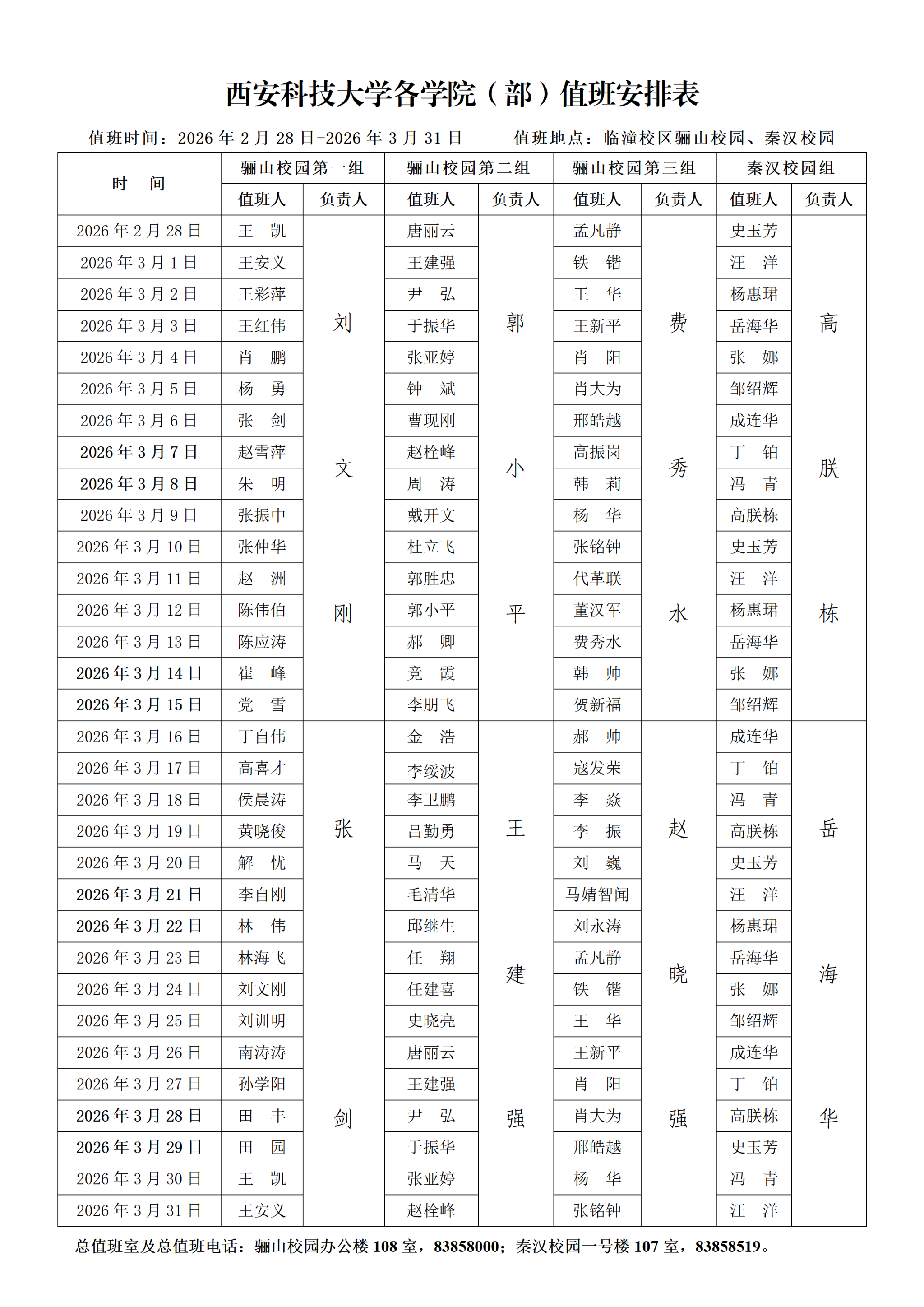 2、西安科技大学各学院(部)值班安排表2026年2月28日-2026年3月31日