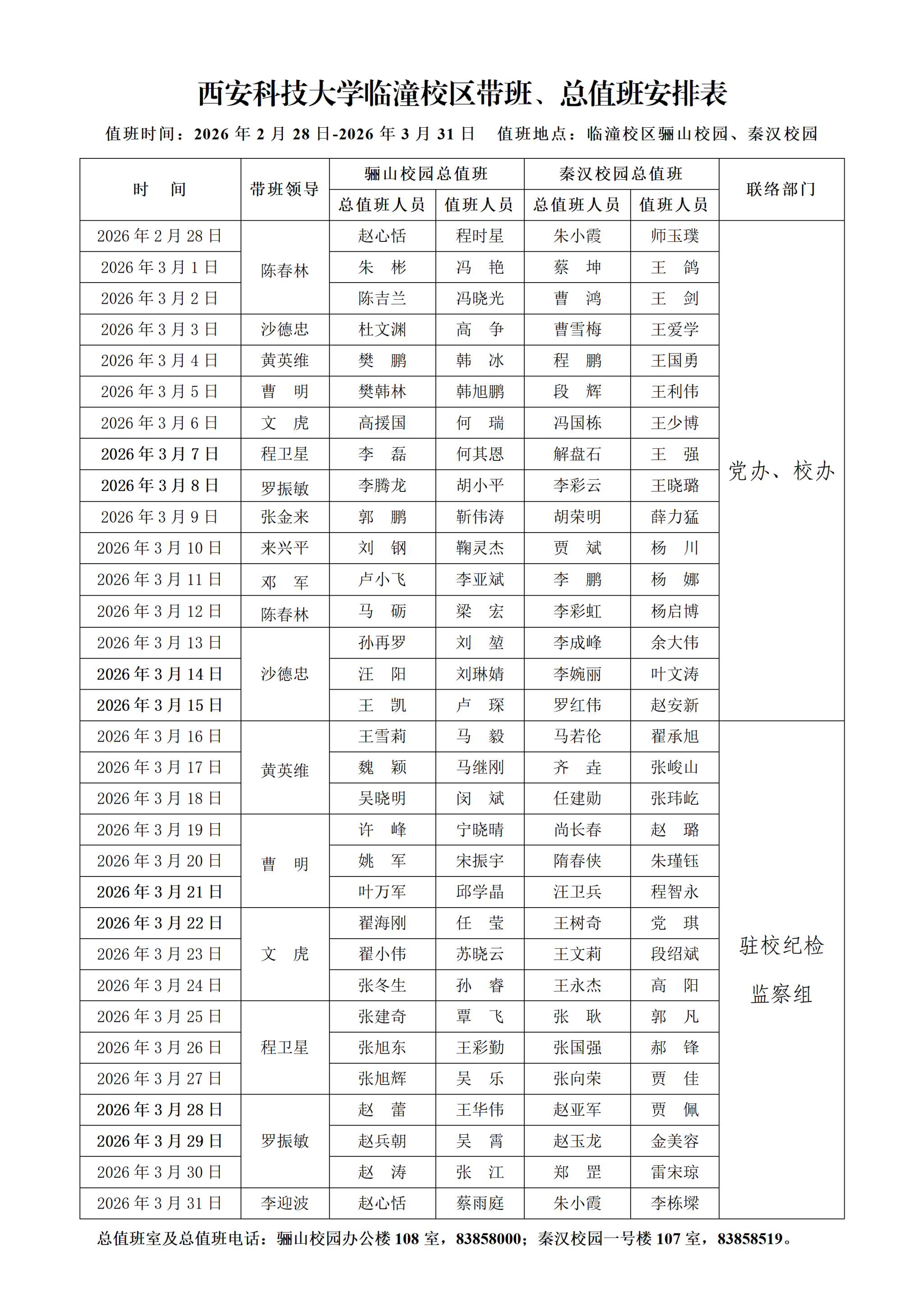 1、西安科技大学临潼校区带班、总值班安排表2026年2月28日-2026年3月31日