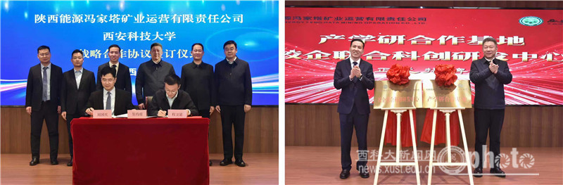 座谈会上,程卫星与刘国庆作为签约代表,签订双方战略合作协议。随后,来兴平与张俊满为“产学研合作基地”“校企联合科创研发中心”揭牌。签约与揭牌,不仅为学校搭建了科研成果从实验室走向产业一线的实践平台,也为冯家塔煤矿破解技术瓶颈提供了坚实的智力支撑与人才保障,更为有力推动双方在煤矿智能化场景打造领域实现优势互补、保障国家能源安全、服务区域经济社会高质量发展注入新的强大动能。